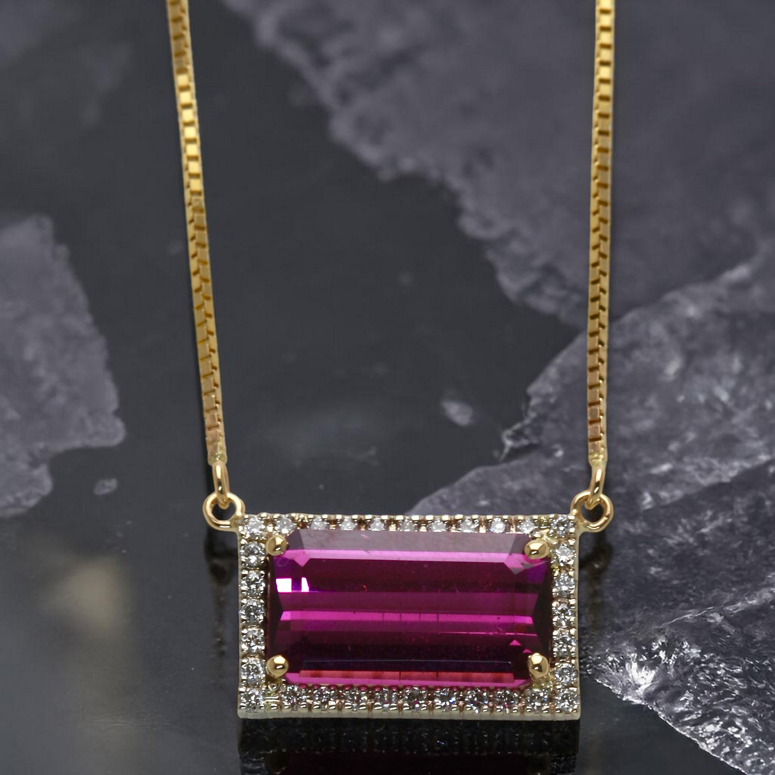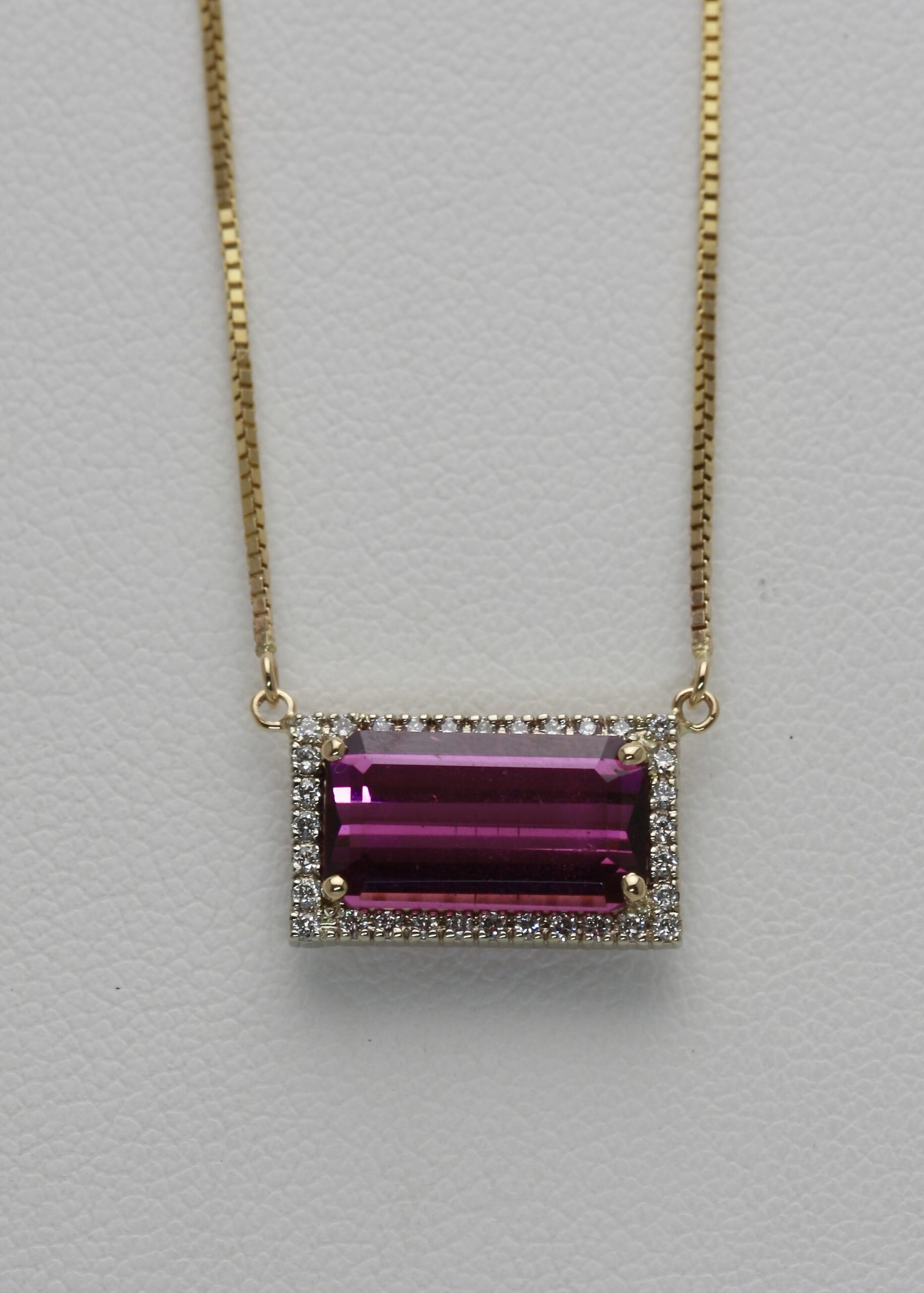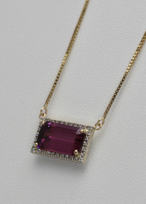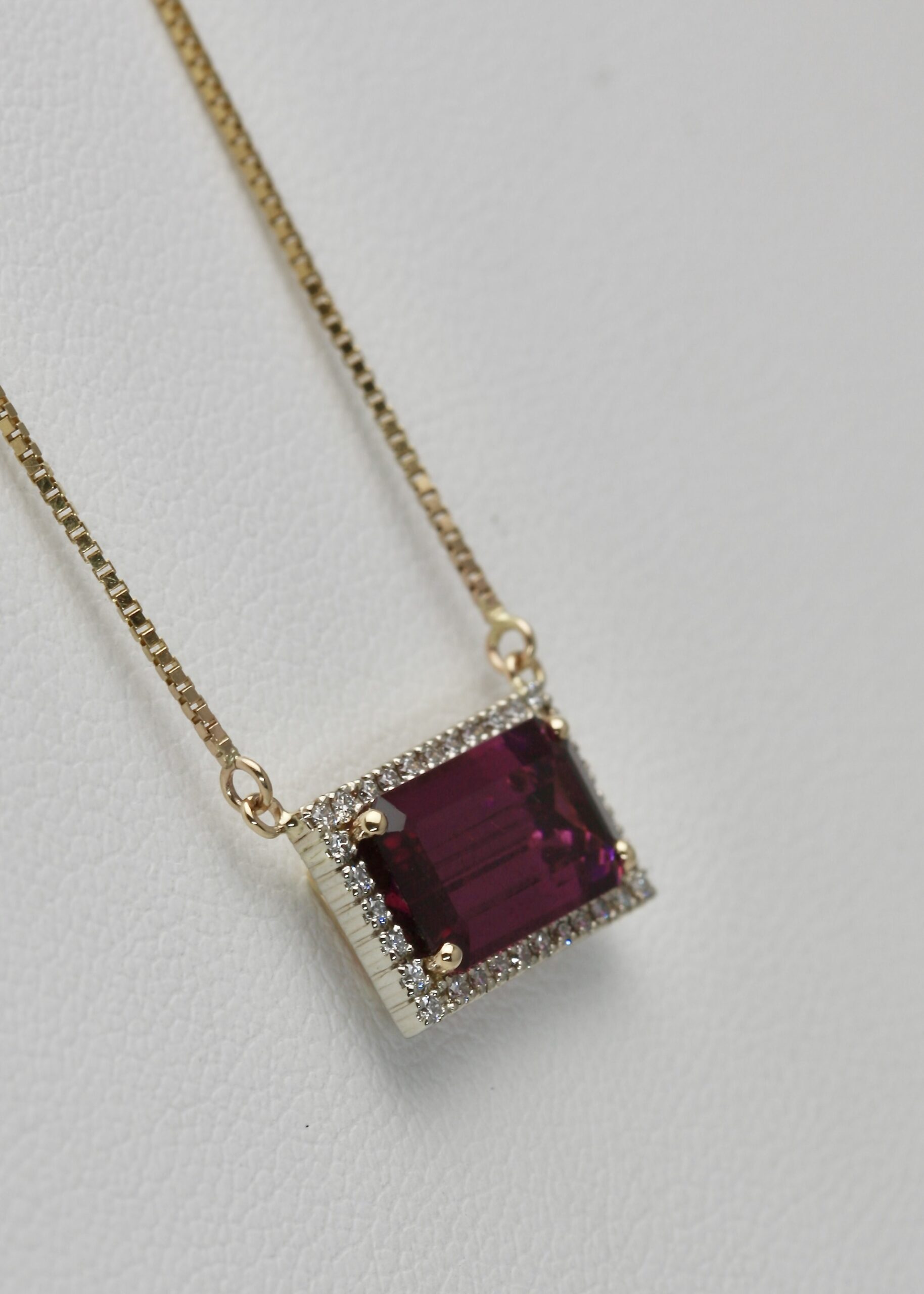 14KYW Rhodolite Garnet Diamond Necklace. Stunning 14 Karat Yellow and White Gold Rhodolite Garnet and Diamond Necklace. The Emerald Cut Rhodolite Garnet (11.9×6.7mm 2.31carats) is surrounded by 32 Round Brilliant Cut Diamonds (0.18 carat total weight) on a 14 Karat Yellow Gold Box Chain 0.72mm wide, Adjustable 17-18″.