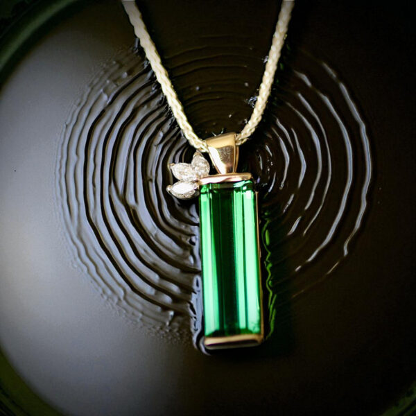 14KY Green Tourmaline 7.87 carat weight (approx 23mm x 7.4mm) with 3 marquise diamonds 0.03 ctw on an 18inch Sterling Silver Wheat chain. Happy to switch the chain for you as requested.